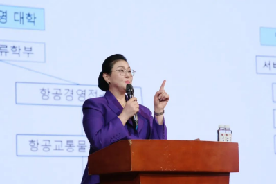 随后,韩国航空大学国际交流学部服务经营专业主任教授李秀卿结合自身经历和教育经验,为泛美学子带来《翱翔云端?智启未来——韩国航空大学教授视角下的航空产业与人才培养》主题讲座,系统解析全球民航产业发展趋势,强调国际化民航人才需具备的重要能力。此外,还重点介绍了韩国航空大学在航空人才培养方面的创新模式与实践成果,展示了这所知名航空学府的独特魅力。