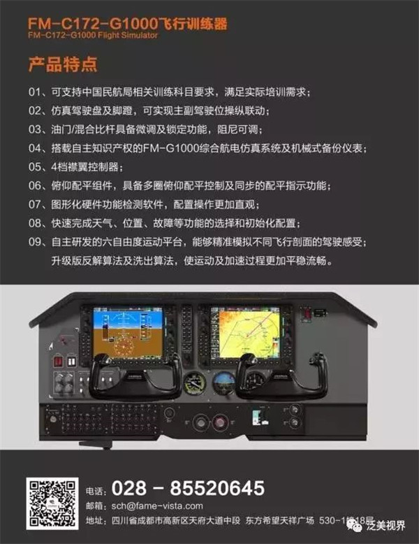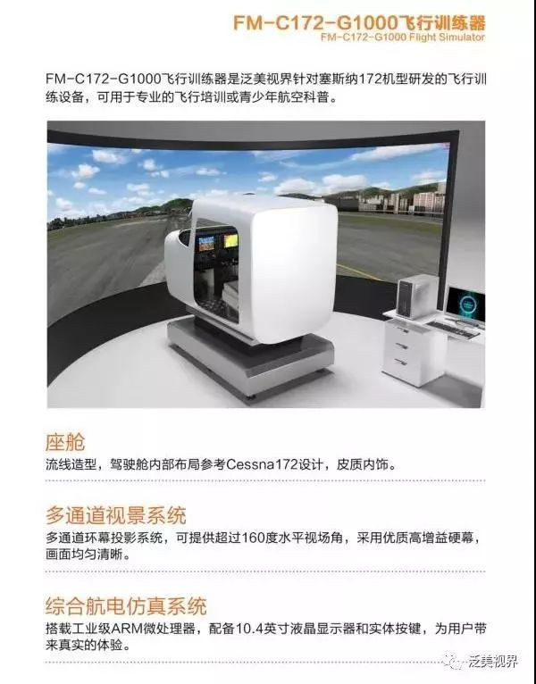 FM-C172飞行训练器是泛美视界针对塞斯纳172机型研发的飞行训练设备,现有FM-C172-G1000、FM-C172R、FM-C172TD-G1000三个版本,可用于专业的飞行培训和青少年航空科普。