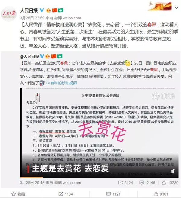 3月28日,泛美教育集团发布《关于“泛美春假”的放假通知》,鼓励全体师生去赏花、去恋爱,积极探索高校情感教育新途径。这一举措受到了社会、媒体的广泛关注,并登上人民日报等主流媒体客户端、网站首页、微博热搜等,引领我国“放春假”风潮。12月12日,发改委有消息称我国将完善带薪休假等相关制度,将根据全国各地气候天气,定制颁布中小学生放春假秋假的方案。