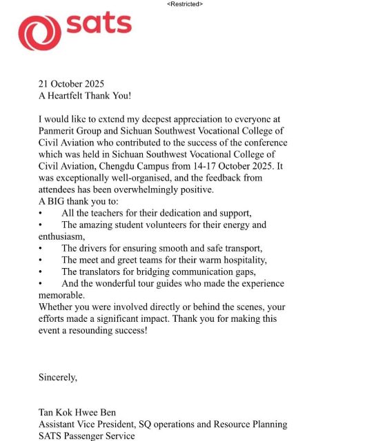 本次以 “聚力伙伴?服务全球” 为主题的 2025 国际航空服务访问交流活动,不仅是一场高规格、高水平的国际性盛会,更是一次深化行业合作、共塑未来发展的成功实践。活动通过扎实的考察、畅通的交流、专业的展示与极致的服务,赢得了新加坡新翔集团(SATS)的高度赞誉与认可。