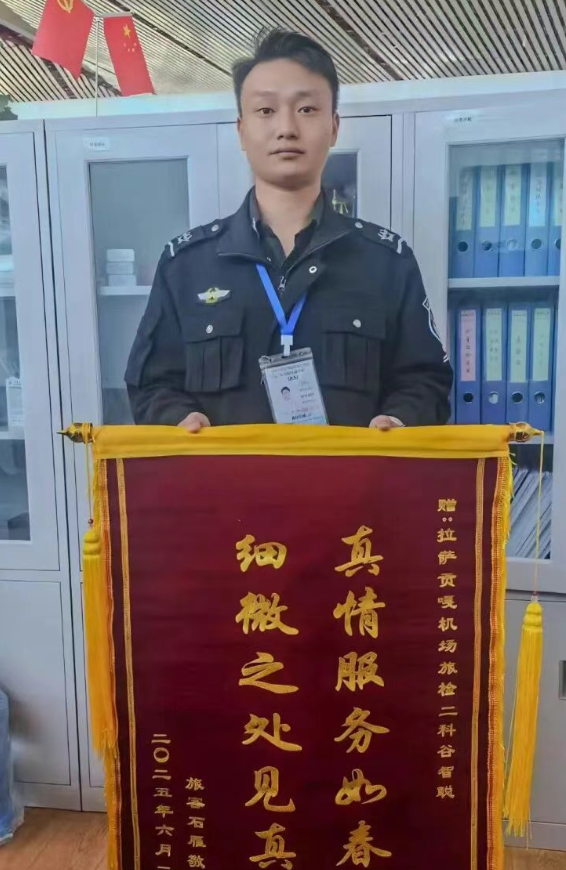 这里的安检标准更为严格:100%人身复检、宗教物品细致查验、氧气瓶严禁携带托运,每一项特殊要求都是对专业能力的考验。谷智聪迅速适应差异化标准,将在校期间习得的安检法规、违禁品识别技能与实训经验充分运用,熟练操作防爆设备,耐心解答旅客疑问,在严格管控与优质服务间找到平衡。在刚刚到岗不到1个月的时间,他便再收获一面锦旗,用扎根雪域的坚守,延续着“守护每一趟航班平安起降”的初心。依托此前在茅台机场、潮汕机场积累的内地安检实践经验,结合扎根拉萨后深耕高原机场的一线探索,该生精准提炼两地机场在安检流程、风险防控、服务适配等方面的核心差异,撰写形成专业详实的差异化分析报告,凭借兼具实操价值与参考意义的研究成果,赢得了部门领导的高度认可与表彰。