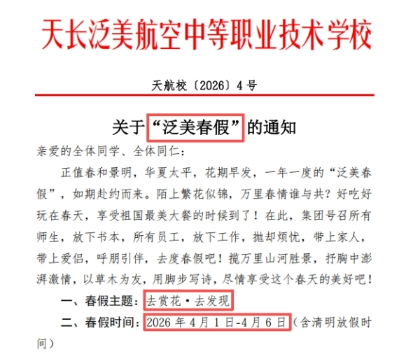 “去赏花·去发现”,在广阔天地间践行“最好的课堂”,3月18日,记者从安徽天长泛美航空中等职业技术学校获悉,该校将于2026年4月1日至4月6日放6天春假(含周末、清明放假时间)。