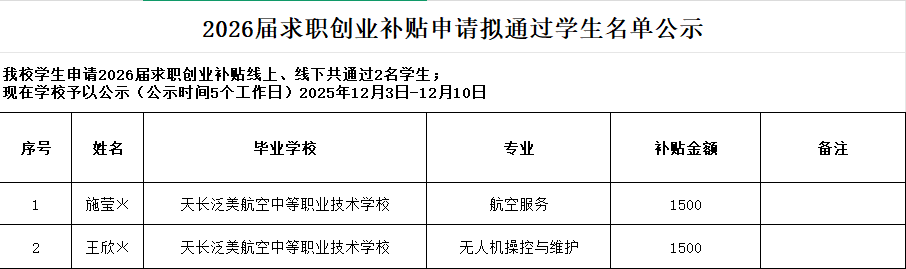 我校学生申请2026届求职创业补贴线上、线下共通过2名学生;
