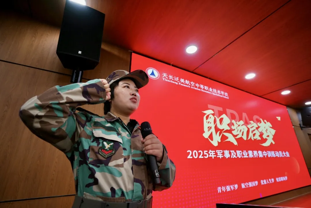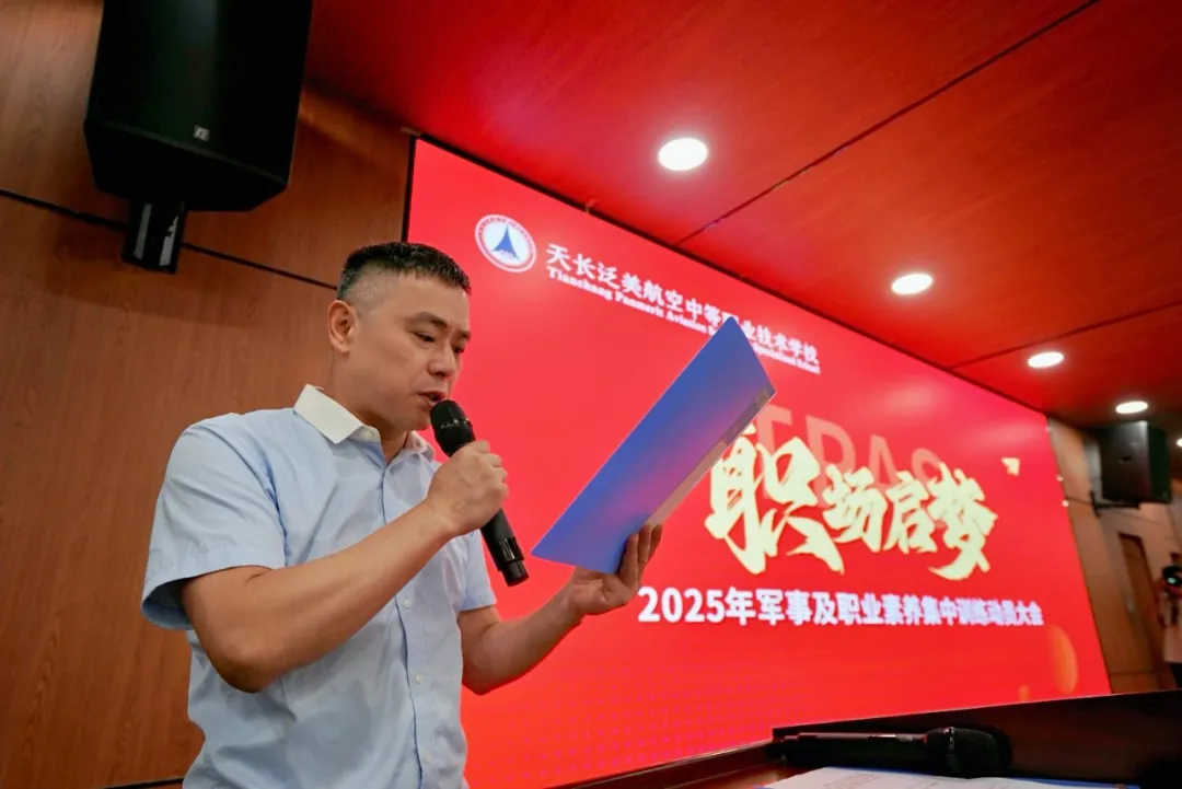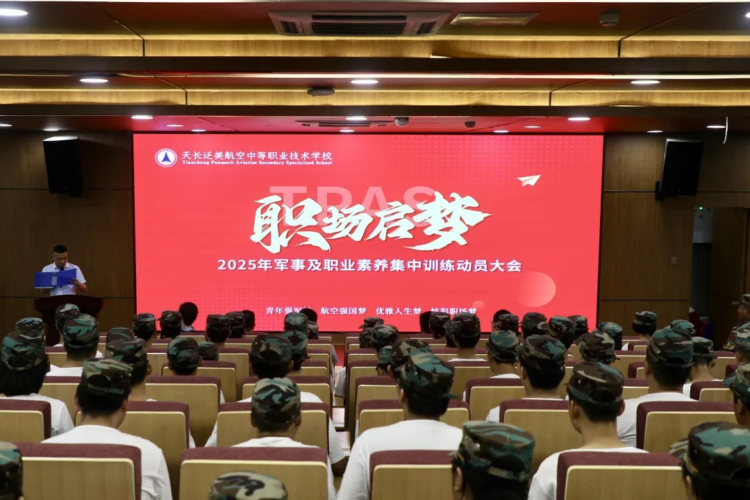 2025年8月11日上午8时,天长泛美航空中等职业技术学校《2025级秋季新生职场启梦军事及职业素养训练动员大会》在庄重而温馨的汇报厅举行。