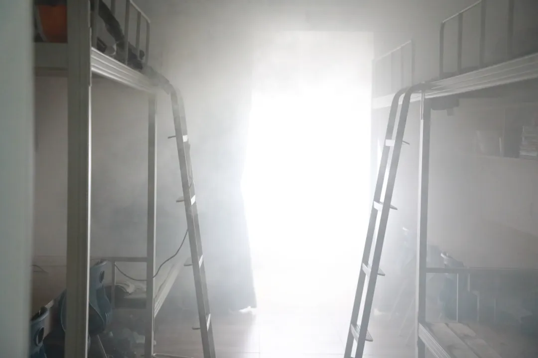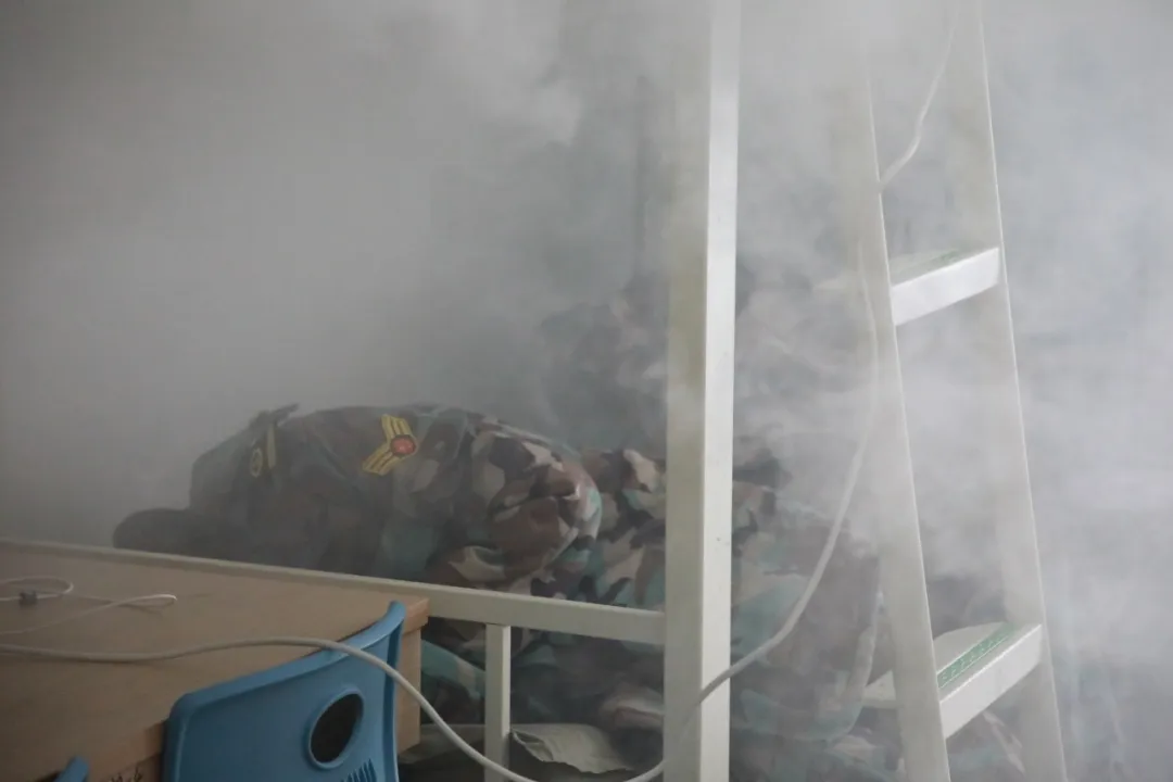 演练场景严格模拟了学生宿舍因违规使用大功率电器导致电气线路短路并引发火灾的全过程。现场浓烟弥漫,警报响起,完整呈现了火情发展的迅猛性与危险性。这一设定直指校园消防安全管理的薄弱环节与风险点,具有极强的现实警示意义。