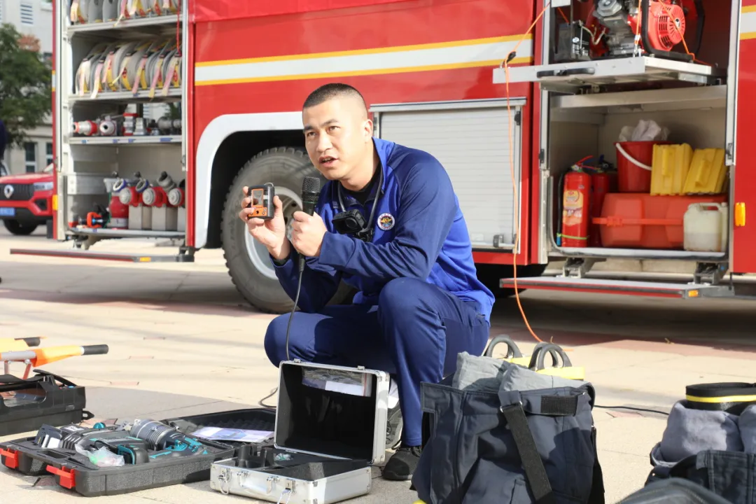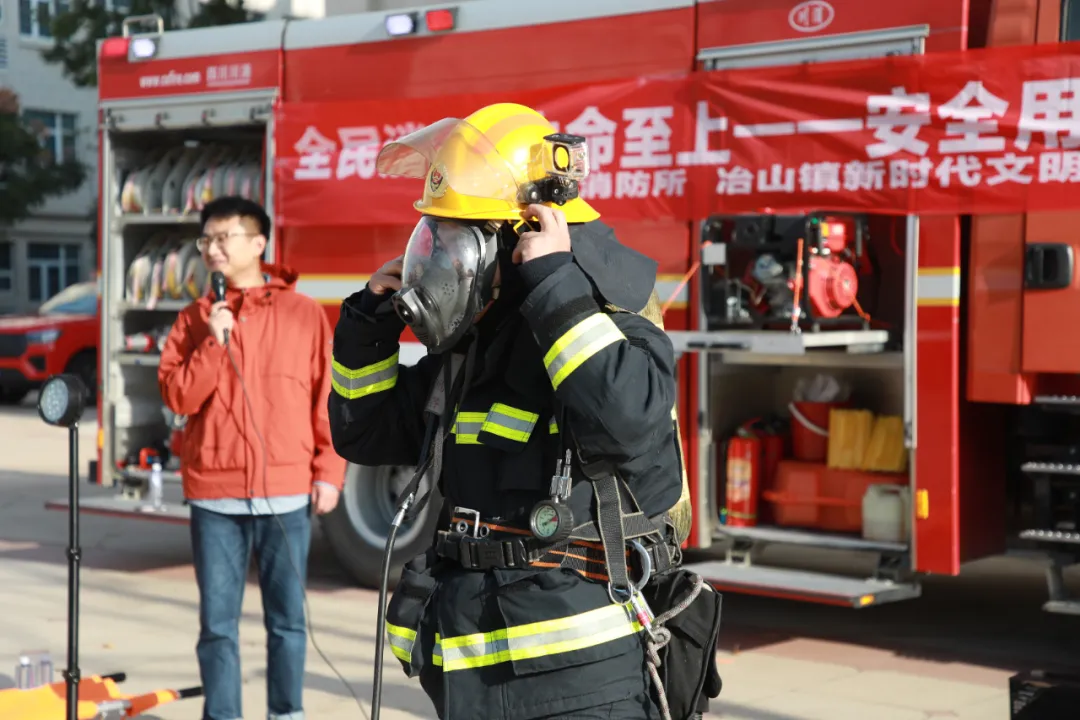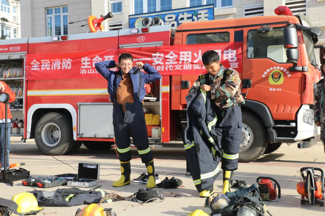 冶山派出所和冶山消防所对此次演练给予了大力支持。民警同志全程参与,并在集结地点对疏散过程进行了专业点评。随后,冶山消防所向全体师生系统讲解和实操演示了灭火器、消防水带等常用消防器材的正确使用方法与注意事项。部分学生还在消防员的指导下试穿了消防服,亲身体验消防员作战状态,深化对消防工作的理解与尊重。