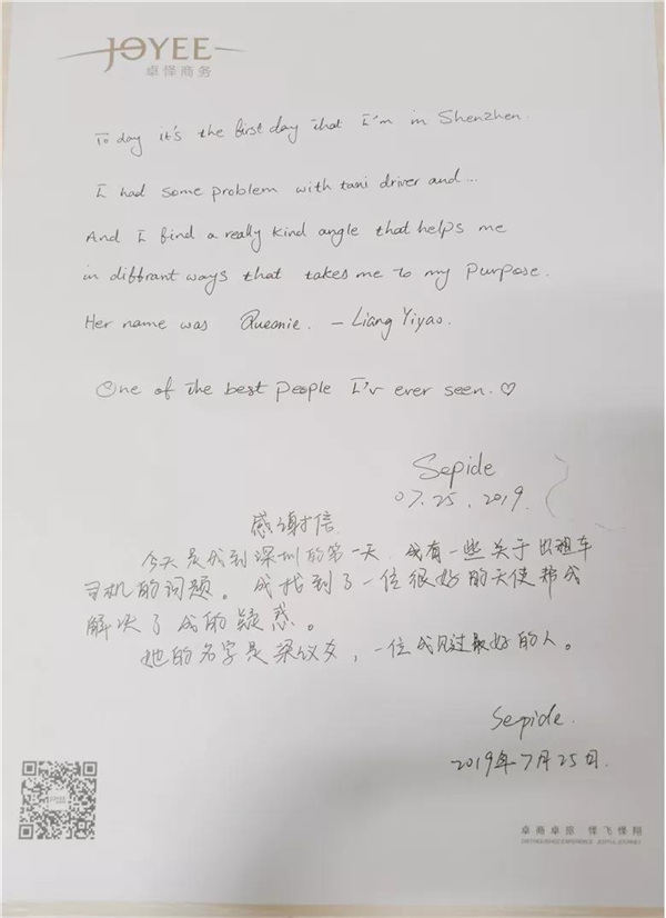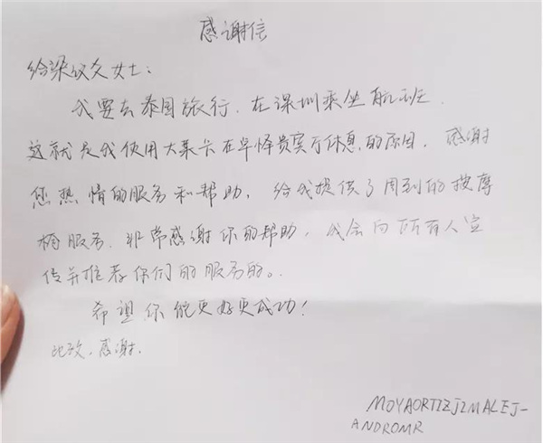 梁议爻说:“她快登机时,一直在前台看着我,我便走上前去询问是否需要帮助,没想到她只是看着我的工牌,问了我的名字后,又认真地读了一遍。然后紧紧握着我的手说,‘梁议爻,这个名字我记住了,我希望你一直都好,感谢你的关心和服务,你笑得很好看,让我觉得很温暖。’”